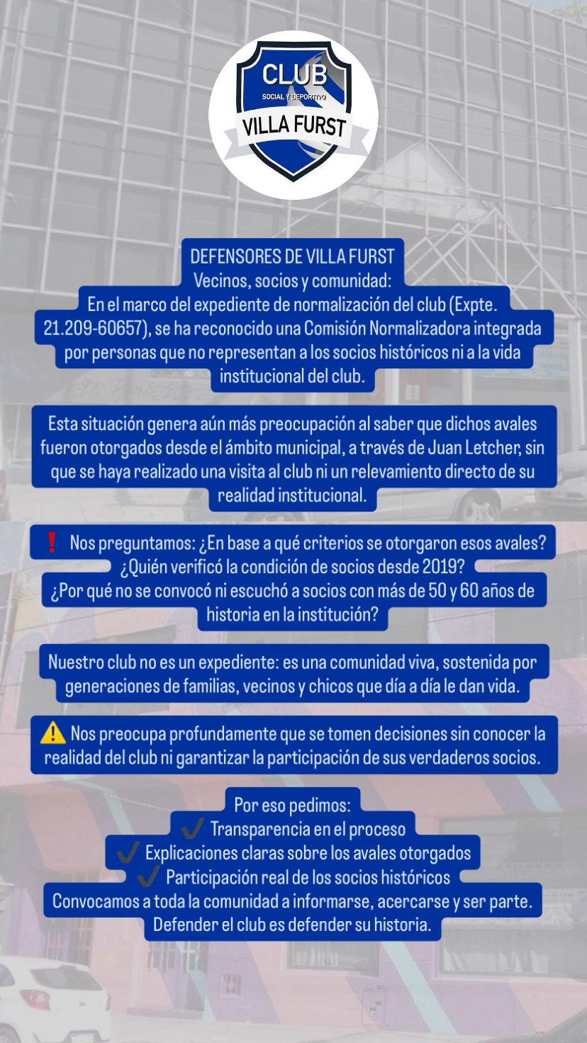 Integrantes del Club Villa Furst -ubicado en San Andrés sobre la calle San Lorenzo 2850- denuncian una situación de conflicto institucional. Según afirmaron, mientras intentan regularizar la situación administrativa del club, un grupo de personas ajenas a la institución inició un trámite con aval municipal que les impide avanzar.